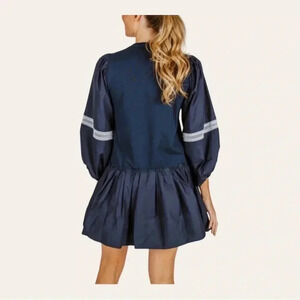 TAYNA TAYLOR KIRSTIE PUFF SLEEVE MIDI DRESS SIZE XSMALL NAVY BLUE/WHITE IN COLOR