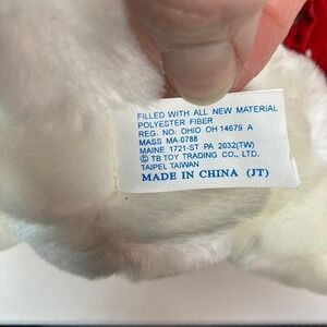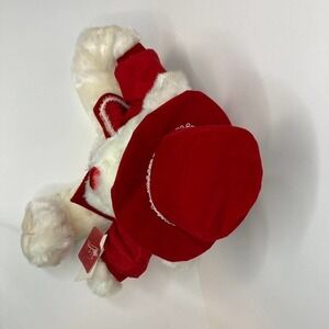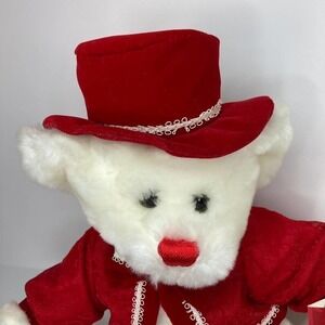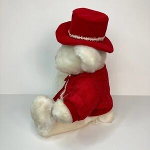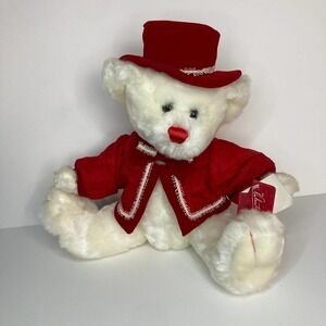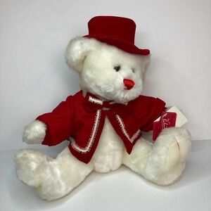 TB Toy Trading Co. Valentine's Day Teddy Bear 11" Plush Red Velvet Top Hat and Jacket. Sweet light cream colored light cream teddy bear with a red embroidered nose by TB Toy Trading Company. He wears a velvet red hat and red velvet trimmed jacket with matching red velvet bow tie. "Dressed Teddy". In great, pre-owned condition. Tush tags intact, hang tags intact, though a corner is torn off.