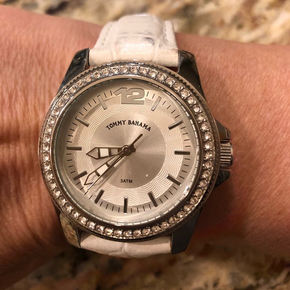 TB white leather band watch, silver with rhinestones around face. Definitely signs of wear & tear. See pics. Needs battery