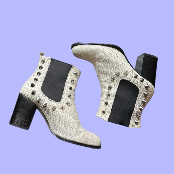 TBA off white spiked boots. 3 inch heels. Leather upper and synthetic soles. Two imperfections - see pictures. Small scuff on right toe and the lining on the right boot at the top is coming undone. Marked as size 9 but fits like size 8. #punk #spikes