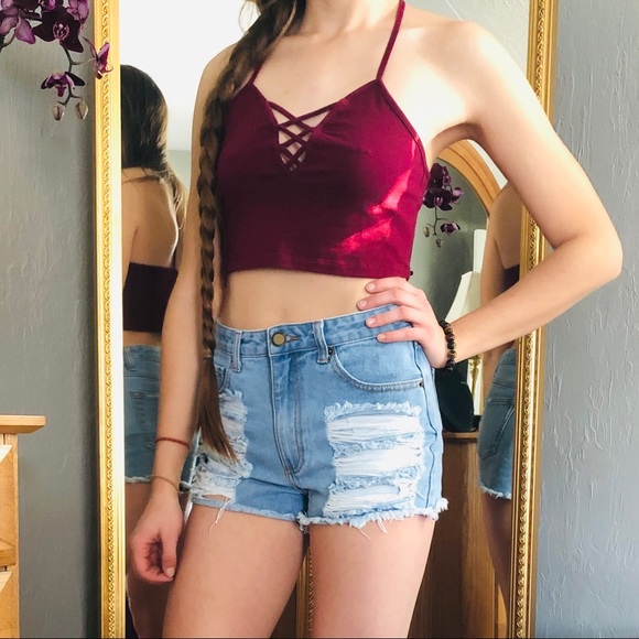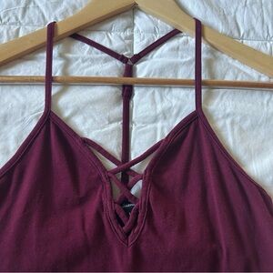Strappy neck maroon cropped tank top with T-back. Only worn once, excellent condition.