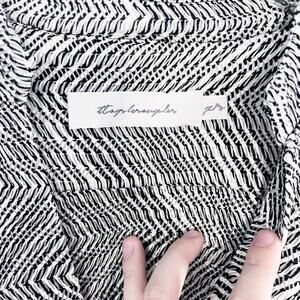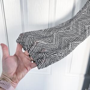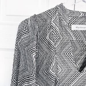 Black and white in a subtle chevron pattern. Unlined. Long balloon sleeves with an elasticized hem. High-side vents. V-neckline. Some stretch. Potentially could be a swimsuit coverup.