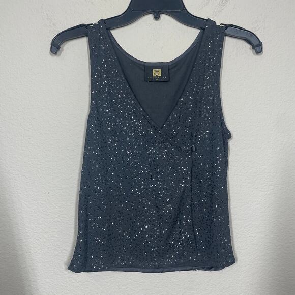 TC Laughlin NYC Size Small V Neck Glitter Wrap Top Blouse Gray Sleeveless