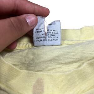 Vintage 1987 T&C Surf Designs single stitch long sleeve in yellow featuring bright pink sleeve hits, yin-yang chest logo, and a colorful back graphic reading “Man’s First Tool” with a caveman carving a surfboard. Rare collectible piece from the iconic surf brand’s comedic graphic era. Good vintage condition with some staining adding character.