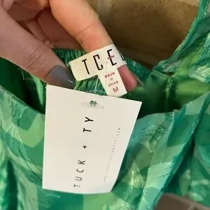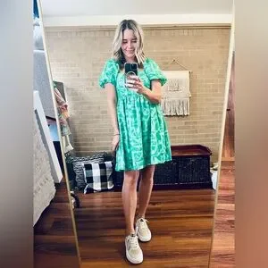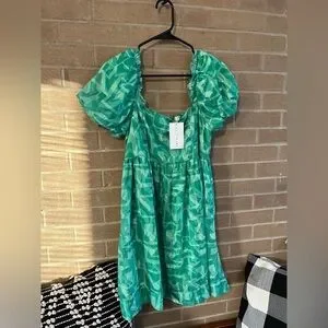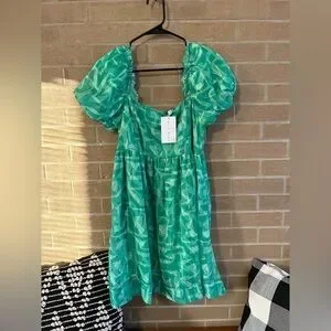 Stylish green dress with puff sleeves. Features a unique pattern.