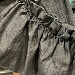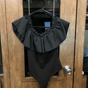 Stylish black top with ruffled off-shoulder design. Ideal for a trendy outfit.