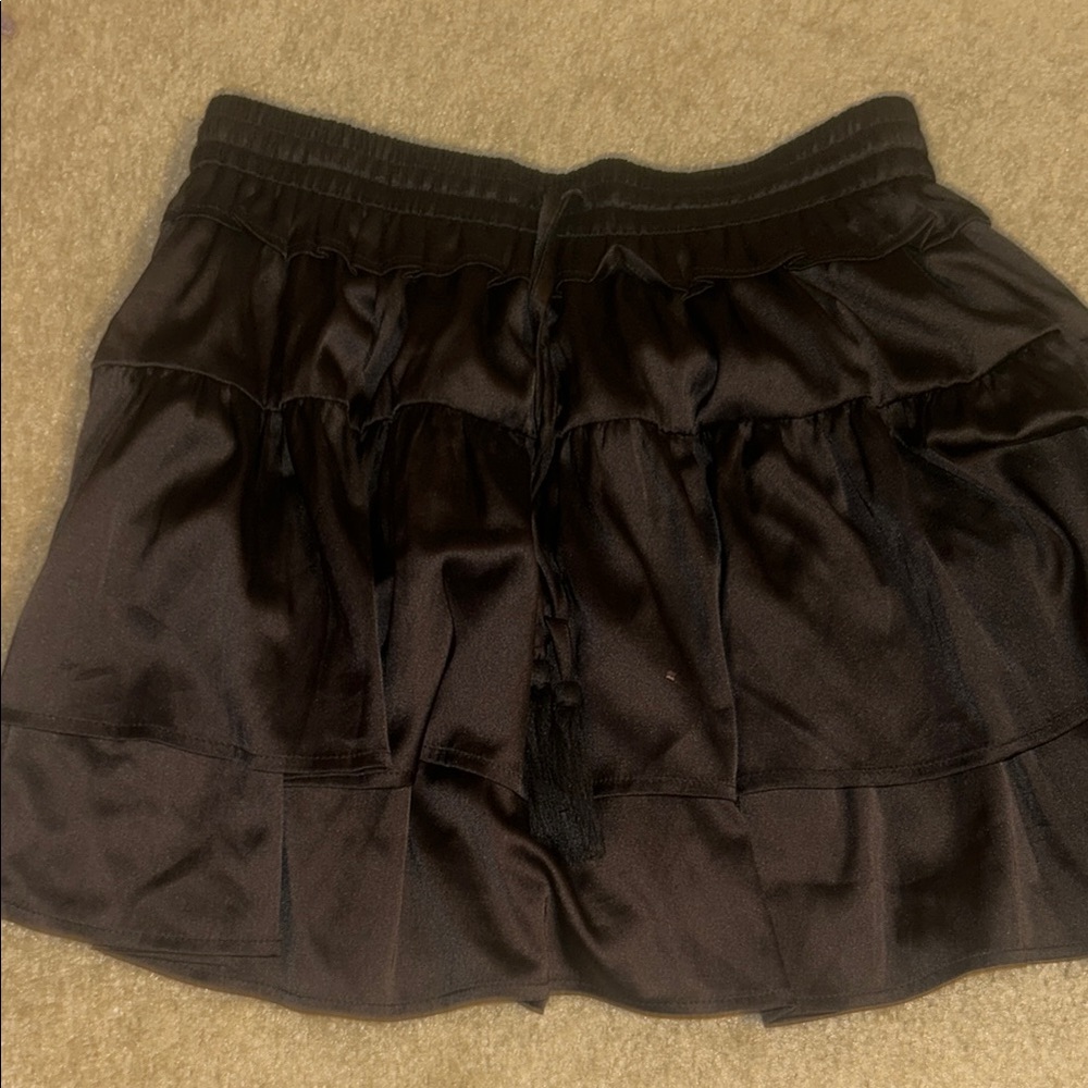 Chic black satin mini skirt with a stylish tiered design. Perfect for a night out.