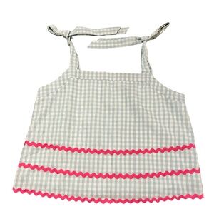 Add a pop of preppy charm to your wardrobe with this adorable two-piece matching set from TCEC. Featuring a classic light blue and white gingham print, this set is elevated by vibrant hot pink ric rac trim on both the top and the shorts.