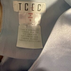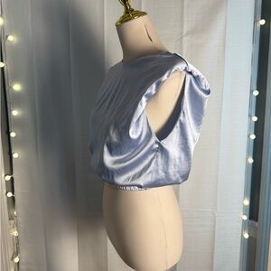 This TCEC top showcases a sleeveless design in a striking blue shade, offering a chic and modern appeal. The boxy, cropped silhouette with a gathered waistband creates a flattering blouson effect. Crafted from a silky fabric with a subtle sheen, it pairs effortlessly with high-waisted bottoms for a stylish ensemble.