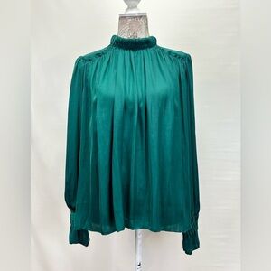Emerald green ruched neckline poet sleeve satiny top from TCEC, size M.