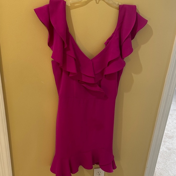 Chic mini dress with layered ruffles. Bold fuchsia color. Perfect for parties.