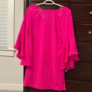 Vibrant hot pink dress. Features long sleeves with ruffle detail. Perfect for any occasion.