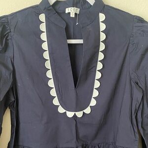 Elegant navy blouse by TCEC. Features white scallop trim. Ideal for stylish occasions.
