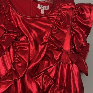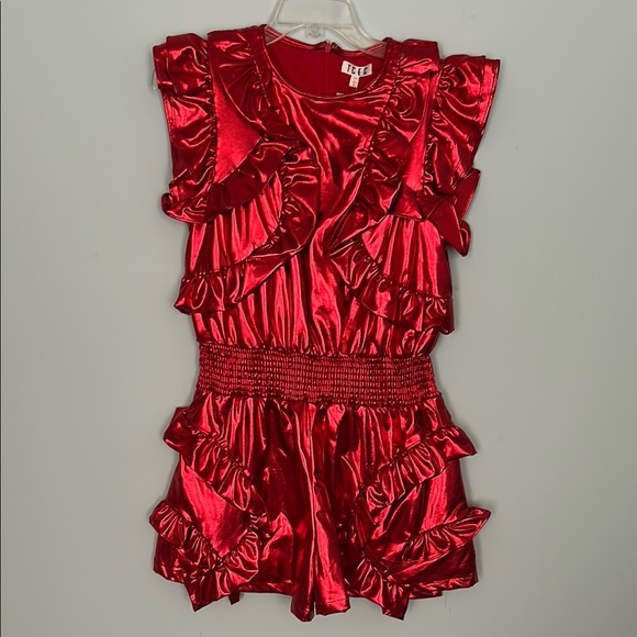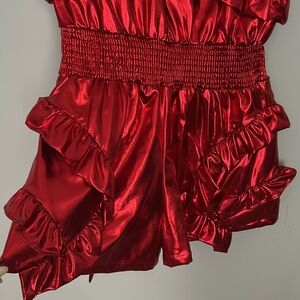 Vibrant red jumpsuit with ruffle details. Sleeveless design. Perfect for a bold look.