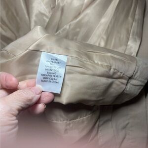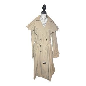 Elegant tan trench coat with double-breasted design and ruffled shoulders Perfect for work or play. This is a beautiful coat (wish it were my size!) a very feminine version of the classic trench coat style.