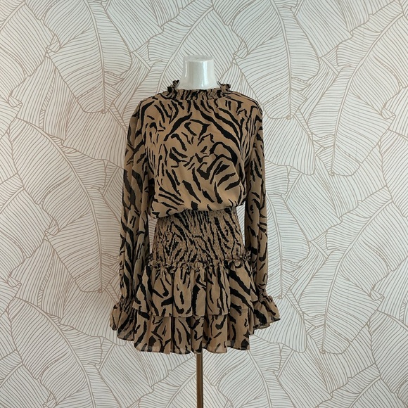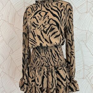 TCEC Leopard long sleeve dress. Chic zebra print blouse with ruffle neckline. Perfect for a bold statement.