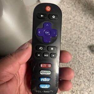 TCL remote with a distinctive purple navigation button. Features quick access to popular streaming services.