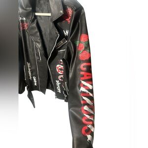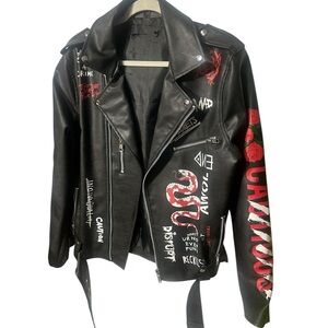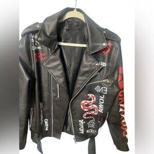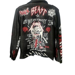 Edgy shirt jacket with striking graphics. Red details and bold patches. Ideal for a modern style.