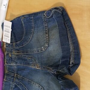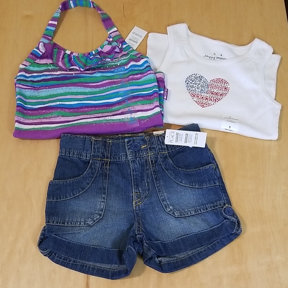 Vibrant striped cotton halter top & denim shorts by The Children's place Flag heart white tank by Jumping beans. All new with tags & cotton š shorts & white tank 100% cotton halter top 95% cotton 5% spandex.