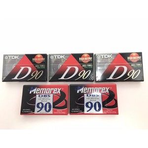 TDK D90 & Memorex DBS Cassette Tapes Lot Of 5 90 Min Blank Audio High Output New. Lot includes: 3 TDK D90 High Output IECI/TYPE I Sealed blank audio cassette tapes 2 Memorex DBS 90 Normal Bias Sealed blank audio cassette tapes Please see pictures for details and feel free to reach out with any questions.