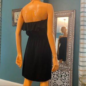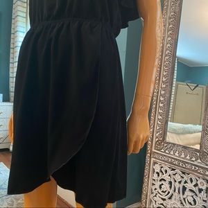 EUC strapless dress from TEA N ROSE with ruffled neckline and faux wrap tulip hem in timeless black. A little longer than mini. Elastic waist.