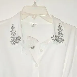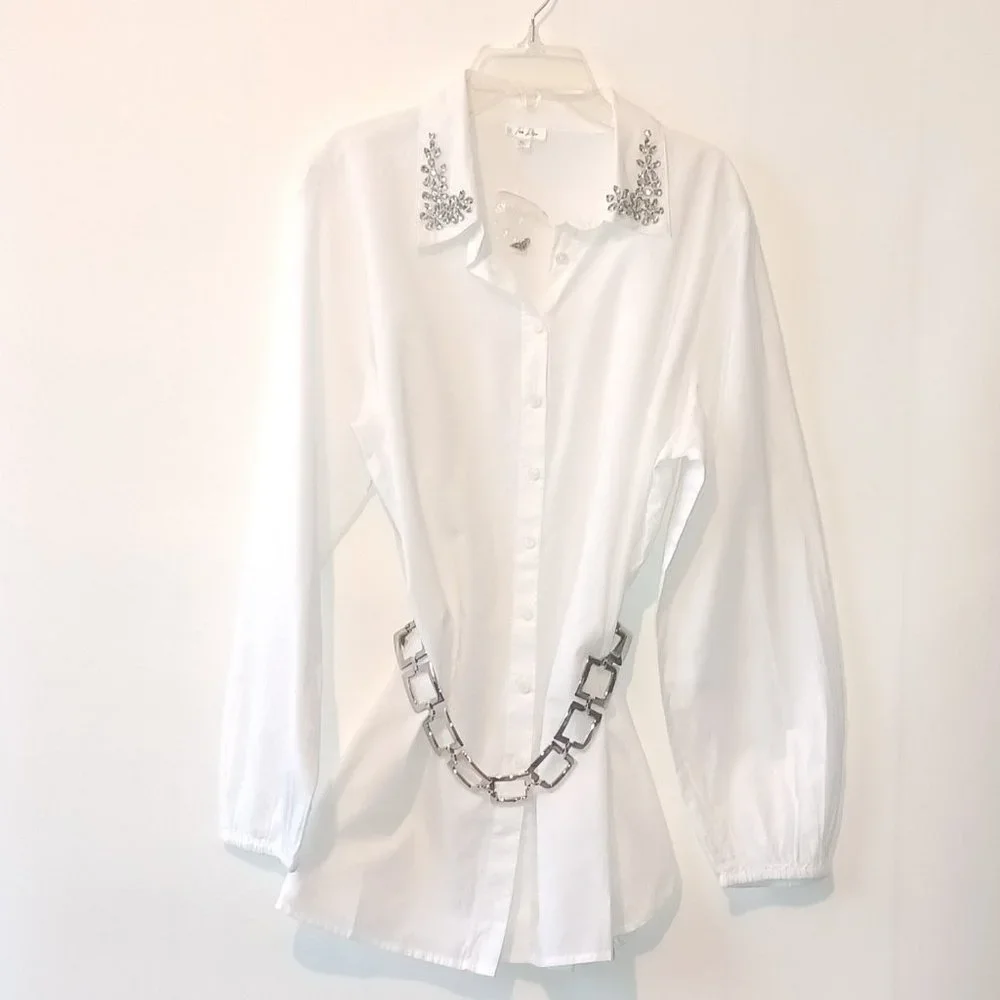 TEA ROSE OVERSIZED BUTTON-DOWN SHIRT WITH RHINESTONES ON THE COLLAR