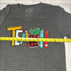 This Spirit to a Tee features a vibrant graphic design of teacher tools on a classic heather gray background. The short sleeve style offers comfort and versatility showing off your teacher style!