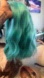 This is a Halloween wig that I purchased on Amazon and I wore once. It is teal. I was the Statue of Liberty. It has a wave in it. And it is about shoulder length.