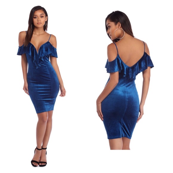 This jewel-toned beauty has a plunging neckline with wiring for structure and support. Neckline is highlighted with flirty ruffles and short cold shoulder sleeves. Dress is composed of a velvet fabric that offers a moderate stretch. Approx. 30" side seam (Measured from under arm to hem of garment.)