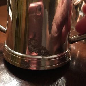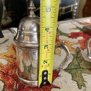 Silver plated teapot set made in India. A very cute set, not too big or small. It is in good condition. The sugar container has a little damage on one side (see photo) the teapot has a little stain inside that I couldn’t remove (see photo).