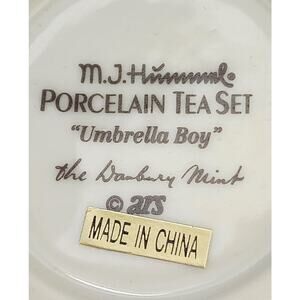 Highly collectible M.J. Hummel art for The Danbury Art. This is a beautiful vintage tea pot and matching creamer pitcher (no sugar). The teapot holds approximately 24 fluid ounces. It is a cream color with gold trim. The top is shaped like the top of an umbrella. The teapot is titled "Stormy Weather" and depicts classic Hummel boy and girl, in traditional German clothing, huddled under an umbrella. The matching creamer pitcher is titled "Umbrella Boy" and depicts a classic Hummel boy under an umbrella. Both pieces have M.J. Hummel signature next to the artwork. Extra detail are embossed dots around the top edging on both the teapot and the creamer pitcher. Beautiful set for any collector. No chips.