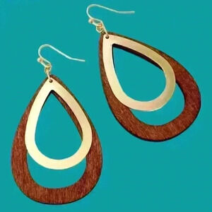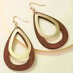 Stunning WOOD and BRASS GOLD Layers TEARDROP Shape Drop Earrings