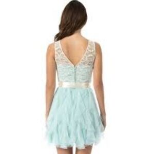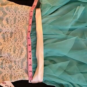Stunning, sweet above the knee length party/prom/homecoming/wedding dress being offered! This gorgeous dress is a beautiful pastel green color. The top above the waste has a form fitting champagne/ivory colored illusion lace bodice that wrap the shoulder tightly (almost like a tank top), and the plunging bustline under the lace is sweetheart cut. The skirt flares out a little bit but is soft and rests on the hips, and is a solid seafoam green skirt with english netting over it, sewn and gathered to look like ruffles. The ruffles are not scratchy or stiff; english netting is soft, loose and a little "stretchy". There is a champagne colored ribbon that ties around the waste, which you can tie in the back or to the side. The dress zips open and closes in the back.