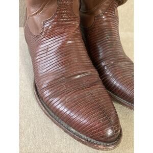 TECOVAS Men’s Nash Bourban Tegu Lizard Boot Sz 11 D 1007 brown Exotic. And great preowned condition. Please see pictures for condition. Does have a black stain as you can see in the picture above.
