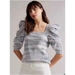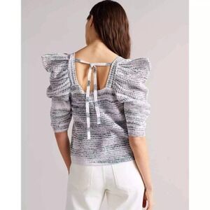 TED BAKER Aspel Puff Sleeve Sweater Womens 12 14 White Gray Marled Tie Back Knit