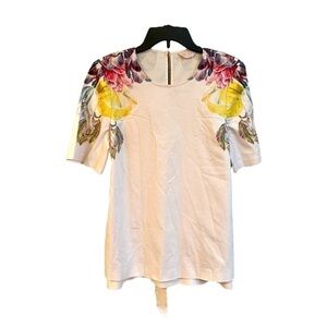 TED BAKER, BONNAY TRANQUILITY, TIE WAIST TUNIC TOP. CAN BE TIED IN FRONT OR BACK, SHORT SLEEVE WITH COLORFUL, FLORAL DISPLAY ON SHOULDERS & SLEEVES. SIDE VENTS. NO SIZE.