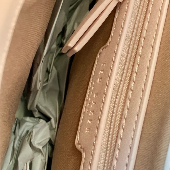 NWT $280 TED BAKER Baby Pink Webbing Darcell Satchel Cross-Body purse Chic and versatile crossbody bag Features a sleek design in a soft blush hue. Ideal for everyday use. FEATURES Webbed shoulder strap, 21" drop Dimensions: 8.8"W x 2.5"D x 7.4"H Magnetic closure Exterior flap pocket, interior pocket Fabric lining Leather; lining: 100% cotton Imported