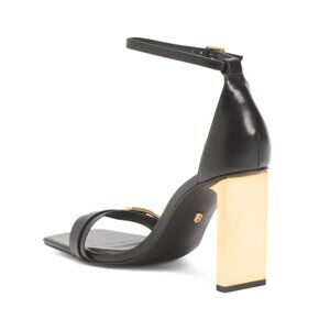 leather lining, cushioned footbed, ankle strap with buckle and goring for stretch, gold tone heel, strap and buckle accent