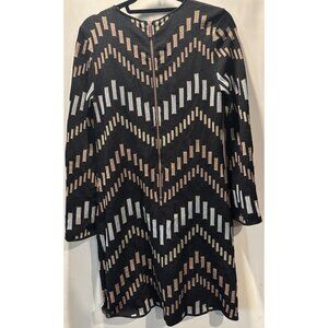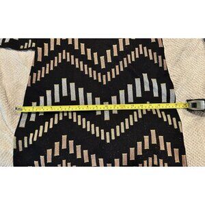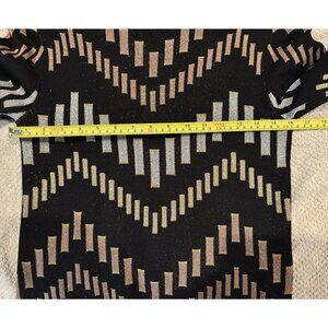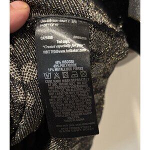 The TED BAKER Black Rose Gold Silver Metallic Bell Sleeve Knit Dress in size 2 (small) is a stylish and versatile option for various occasions. With a geometric pattern, long bell sleeves, and a round neckline, this dress is perfect for parties, formal events, or business meetings. Made from a blend of polyester and viscose, the dress features a zip closure and a midi length. The metallic silver accents add a touch of glamour, making it a standout piece in your wardrobe. Ideal for summer, fall, or spring, this A-Line dress from Ted Baker is a must-have for any fashion-forward woman.