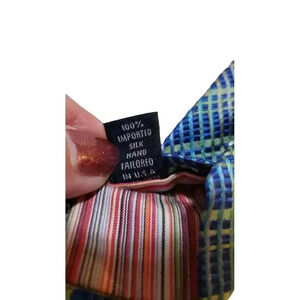 Elevate your professional look with this stunning Ted Baker neck tie. The vibrant multicolor geometric stripe design is perfect for adding a pop of color to any outfit, while the 100% silk material ensures luxurious quality. This tie is handmade in the United States and features an adjustable, classic length (57 in.-60 in.) and width, making it a versatile addition to any wardrobe. Ideal for office, sales, or board room use, this tie is one size fits all and is sure to impress. The logo accents add a touch of sophistication to the retro-inspired theme, making it a great choice for the American businessman. Whether you're attending a meeting or dressing up for a formal event, this neck tie is the perfect accessory to elevate your style.