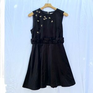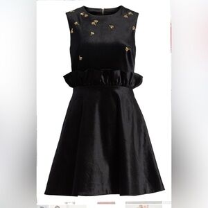 • Black velvet dress. Mini. Ruffle waistline. Gold bees are embellished along the neckline. Round neckline. Back side zipper. Sleeveless. Fit and flare fit. Lined. 50% cotton. 50% viscose.