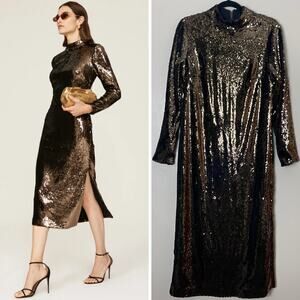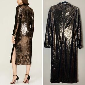 TED BAKER DRESS CHOCOLATE BROWN SEQUIN BROOKLYN TUBE LONG SLEEVE MIDI METALLIC