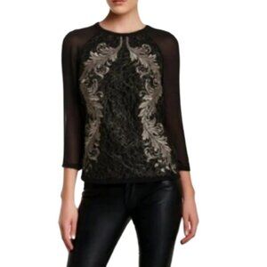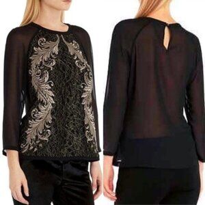 Gorgeous Ted Baker Hadara black and metallic gold embroidered lace front blouse with sheer sleeves and sheer back, perfect for an upscale party or dressy with jeans.