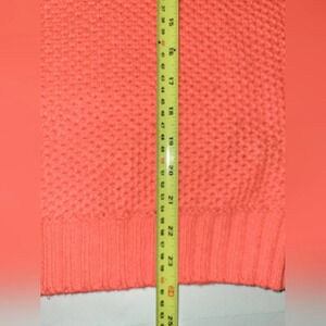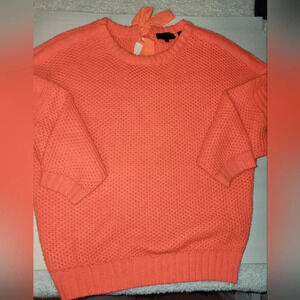 Pre-owned and in good condition with gentle wear. Light neon coral orange in color. Three-quarter length sleeves with dropped shoulder knit work detail. Pretty ribbon tie at back of heck. Super soft knit.