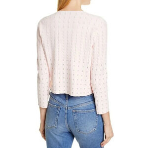 A single rose gold hook fastens a textured cardigan, cut in a diminutive silhouette and delicately dusted with metallic accent stitching.