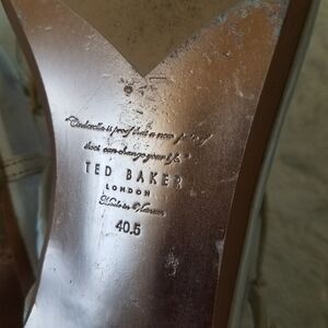In excellent condition, white leather croc embossed, strappy, side buckle, "T" gold embellishment semi-square toe, low heel, size 40.5