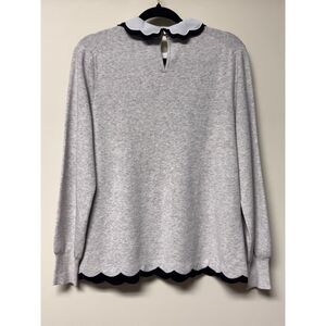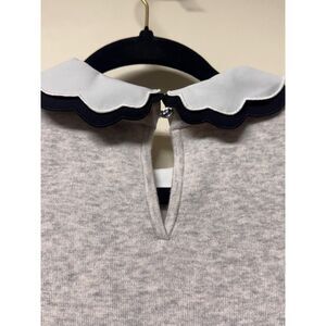 Beautiful wool/cashmere blend layered look sweater. Scalloped, layered white and black Peter Pan collar. Light gray body with scalloped hem with black trim. Hand wash cold, lay flat to dry.