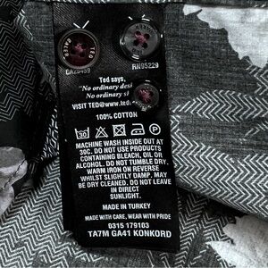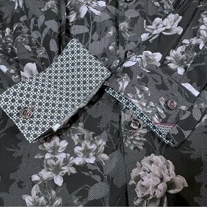The Ted Baker London Men's Dress Shirt features an elegant blend of modern style and subtle flair. Its adorned with a striking floral pattern in shades of gray and black with a hint of pink that adds a unique touch without overwhelming the look. The long sleeves showcase a contrasting roll-up cuff and is crafted with premium cotton and dark buttons.