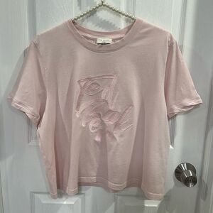 This item is gently used and made of 100% cotton. It features a crewneck, pullover style, and a logo at the front. The bust measures 23 inches, and the length is 21 inches. It can be machine-washed for easy care.