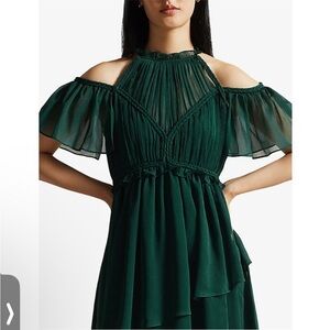This stunning emerald green dress is designed with elegant pleats and a mock neck, making it ideal for formal occasions or grabbing dinner with friends. The flutter sleeves add a playful touch, while the flowing skirt ensures a graceful silhouette with Lined Chiffon Style Material. Perfect for a wedding guest or cocktail event, this dress combines style and sophistication effortlessly.